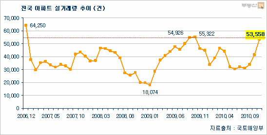 전국 아파트 실거래량이 3개월 연속 증가세다. 국토해양부가 이달 15일 발표한 11월 전국 아파트 실거래 건수는 총 5만 3558건으로 전 월 대비 29.5% 늘었다. 올 들어 월간 거래량 중 최고치이며 작년 10월 거래량 5만 5천여 건 이후 가장 많다.