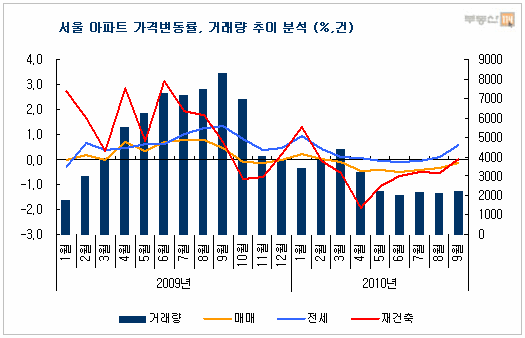 주택시장의 경우 지방 대도시들이 소형 주택 중심으로 상승세를 보이고 있고 서울 수도권의 낙폭도 많이 둔화됐다. 전셋값이 오르면서 교통환경이 양호한 중소형 아파트가 계약되는 실정이다. 국토해양부가 발표한 실거래량을 봐도 9월-10월 저가매물 중심의 거래가 늘어났고 경매 낙찰건수도 증가하고 있다. 부산 등 최근 공급을 대폭 줄였던 지방 광역도시에서 미분양이 줄고 실수요 중심으로 소형 주택 가격이 오르자 지방과 같은 양상이 수도권에서도 반복될 것으로 보는 시선도 나타났다.